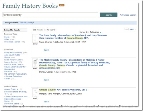 Using the same search for books related to the history of Ontario County, New York, I used the same general search string ontario county new york history and received 6,705 results.  Many of the results seemed irrelevant.  So I tried using quotation marks and the word and (then the + sign) and while the results narrowed down considerably, there was still a lot of irrelevant results.  So I used the search string “ontario county” and came up with 598 results.  This of course broadened it beyond a county history, but the results were at least centered on Ontario County (in and out of New York).  The website is in Beta, so maybe there will be some improvements to the search in the future.